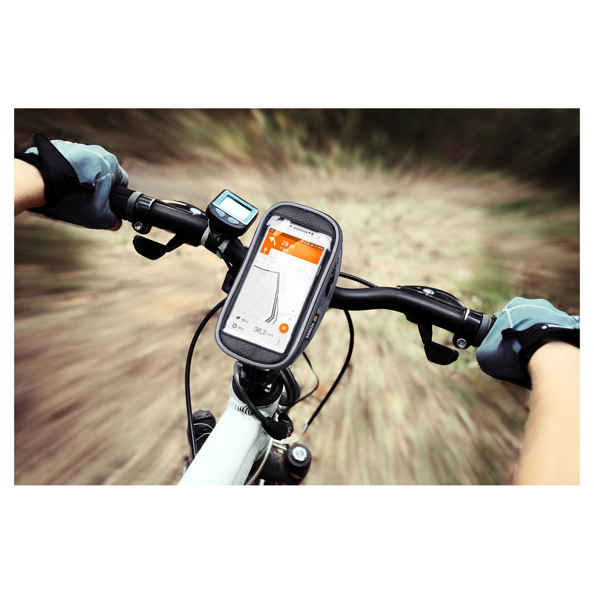 Υποδοχή τηλεφώνου για τιμόνι ποδηλάτου, με θήκη για μικρά αξεσουάρ. Οθόνη αφής υψηλής ευαισθησίας σας επιτρέπει να χρησιμοποιείτε το smartphone σας ενώ οδηγείτε. Σκληρή θήκη παρέχει προστασία από σκόνη, γρατσουνιές και πιτσίλισμα νερού. Για πρόσθετη οδική ασφάλεια, οι πλευρές της θήκης είναι κατασκευασμένες από ανακλαστικά υλικά για καλύτερη ορατότητα στο σκοτάδι.