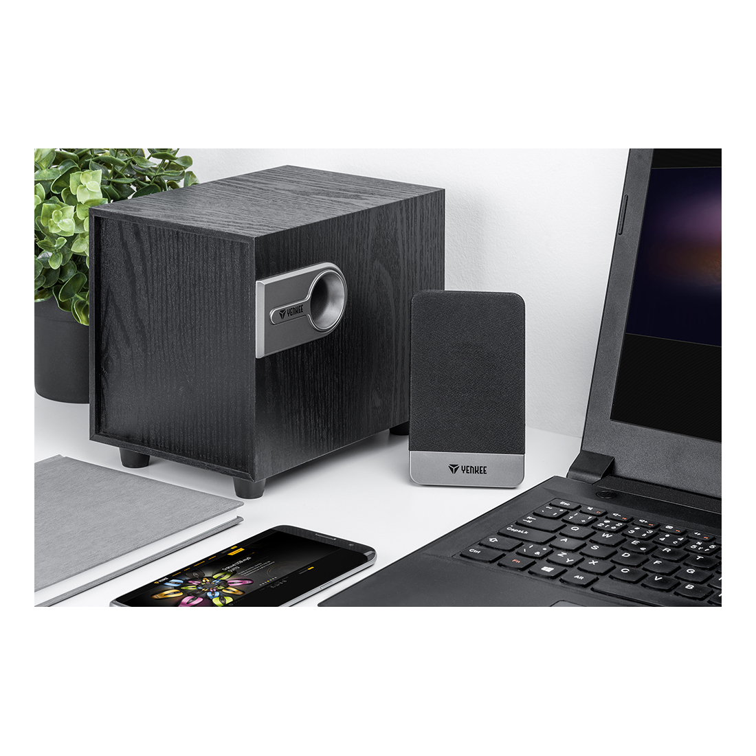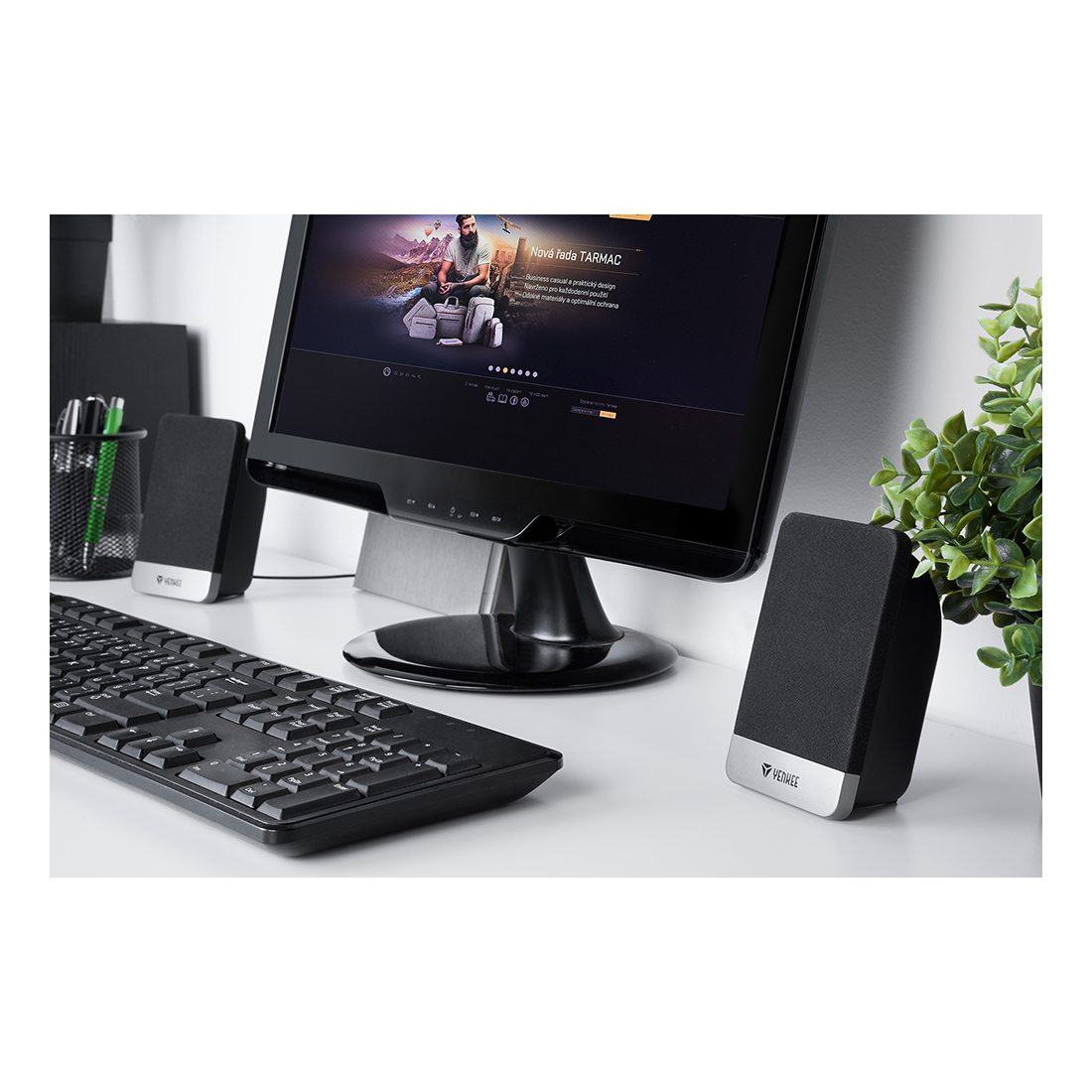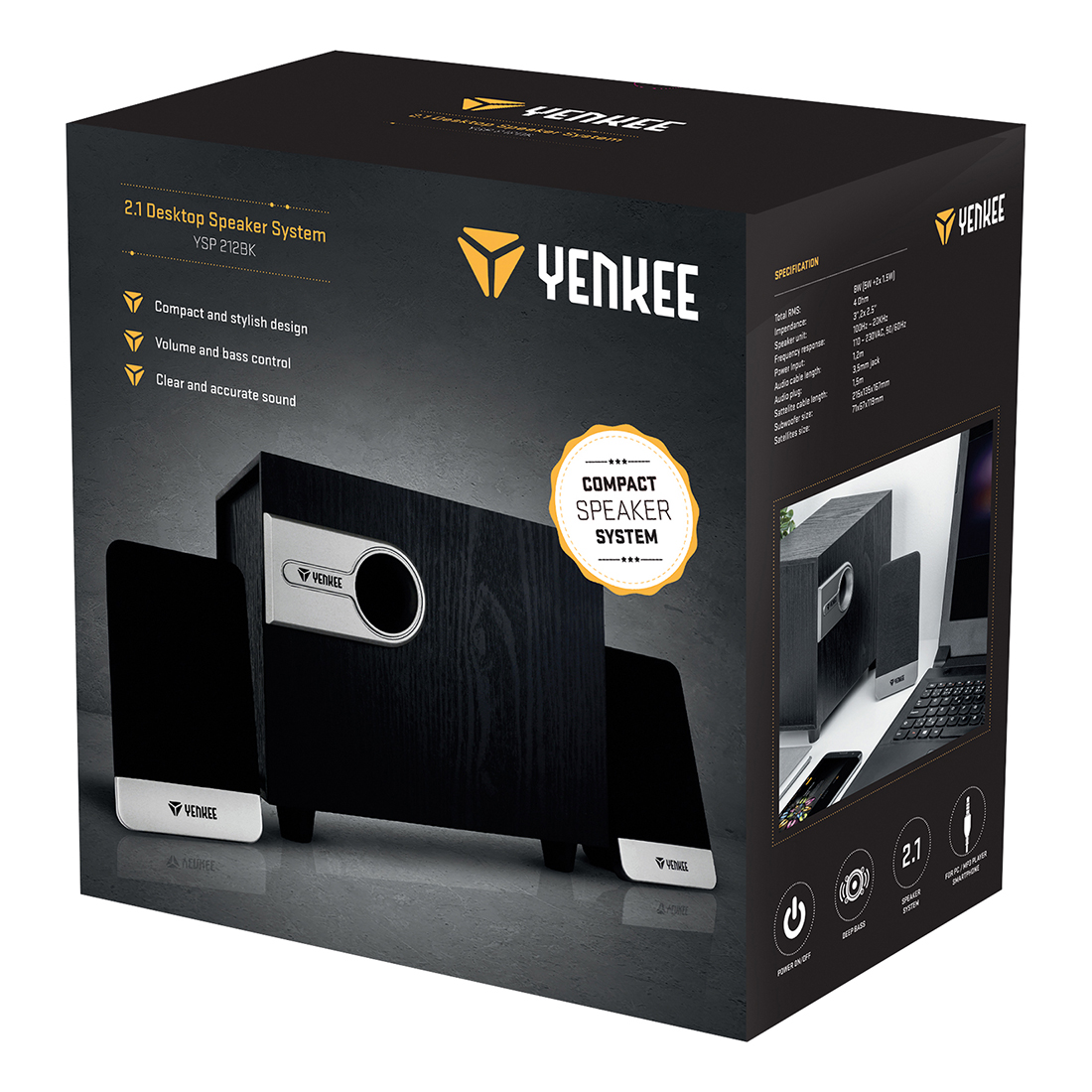 Το συμπαγές μέγεθος σας επιτρέπει να τοποθετήσετε τα πλευρικά ηχεία στο γραφείο εργασίας σας δίπλα στην οθόνη ή το λάπτοπ σας και να υπάρχει ακόμα αρκετός χώρος εργασίας γύρω τους.