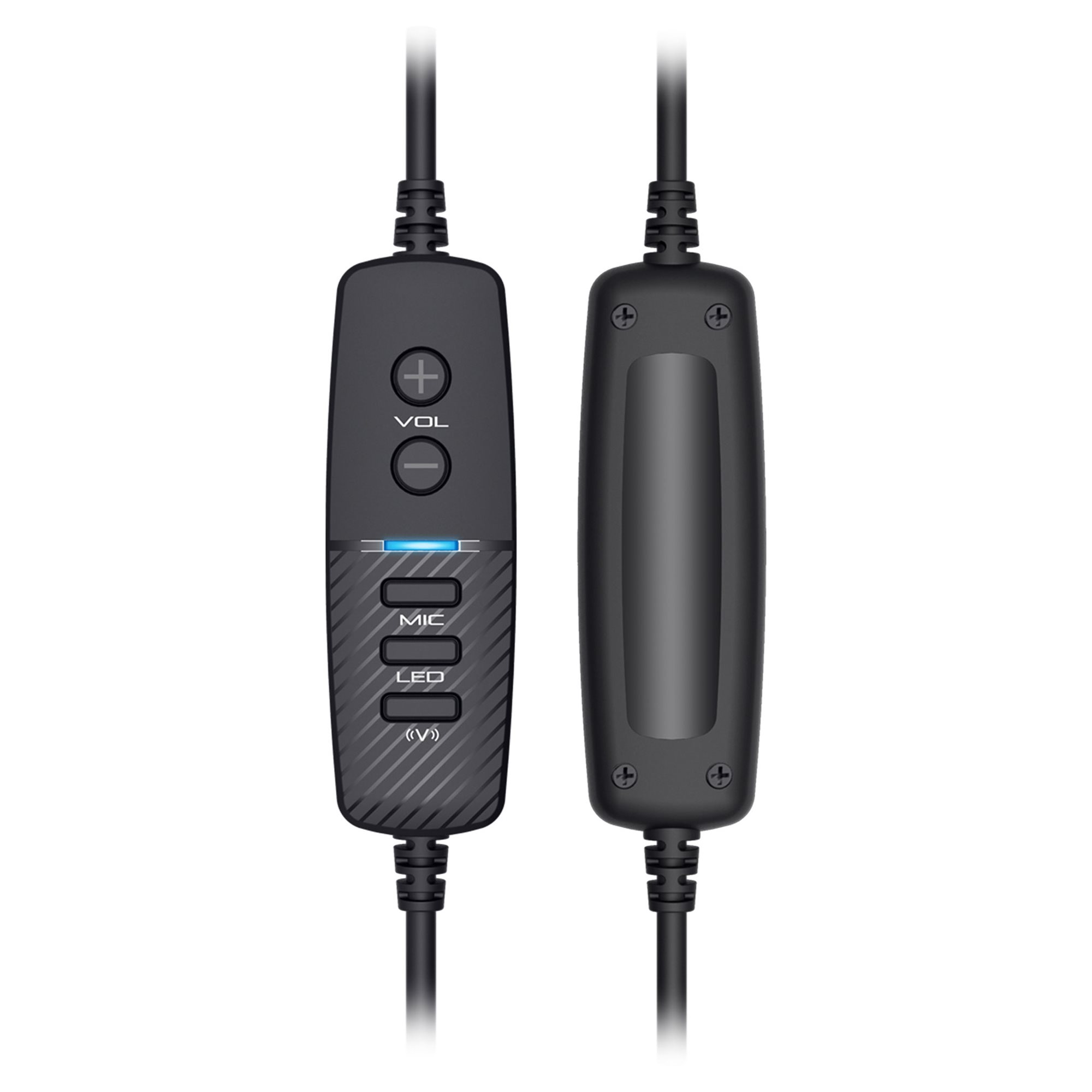 Μέσα στο σώμα μου θα βρεις διακριτικό φωτισμό LED για περισσότερο στιλ στο gaming. Όλα τα φωτεινά στοιχεία έχουν σχεδιαστεί ώστε να με βρίσκεις εύκολα σε σκοτεινό περιβάλλον, χωρίς όμως να εμποδίζουν εσένα ή τους συμπαίκτες σου στο παιχνίδι. Κάτι άλλο που θα εκτιμήσεις ιδιαίτερα είναι η επιλογή σίγασης του μικροφώνου απευθείας πάνω στο χειριστήριο έντασης στο καλώδιο.