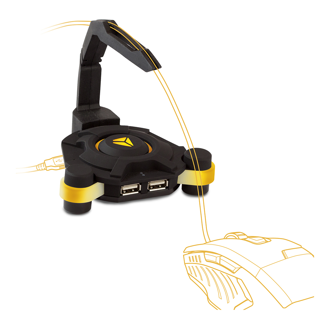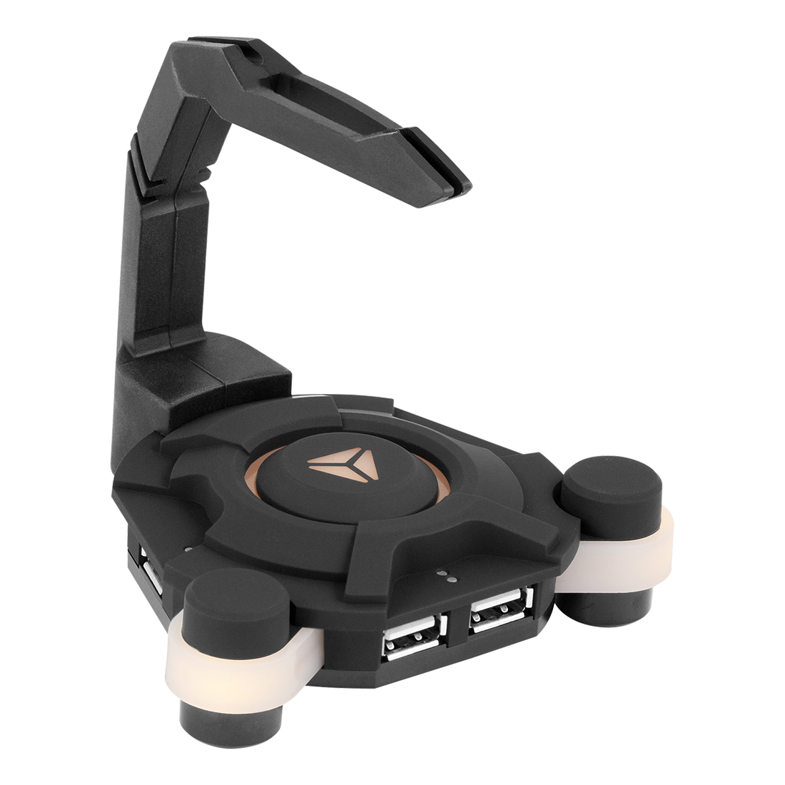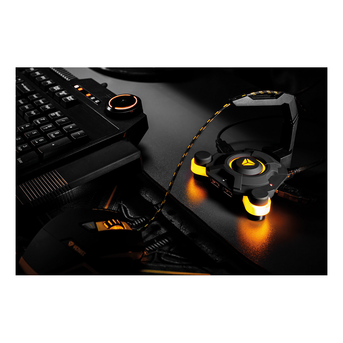 4 θύρες USB μπορούν να διαχειριστούν όλα τα καλώδια USB στην επιφάνεια του γραφείου σας. Ευχάριστος πορτοκαλί οπίσθιος φωτισμός με διακόπτη on/off θα σας προσφέρει τη σωστή ατμόσφαιρα για gaming. Το εύκαμπτο στήριγμα καλωδίου πολλαπλών κατευθύνσεων είναι αποσπώμενο. Η πλήρης ευστάθεια εξασφαλίζεται με εσωτερικά αντίβαρα και τριγωνική επιφάνεια βάσης από σιλικόνη.