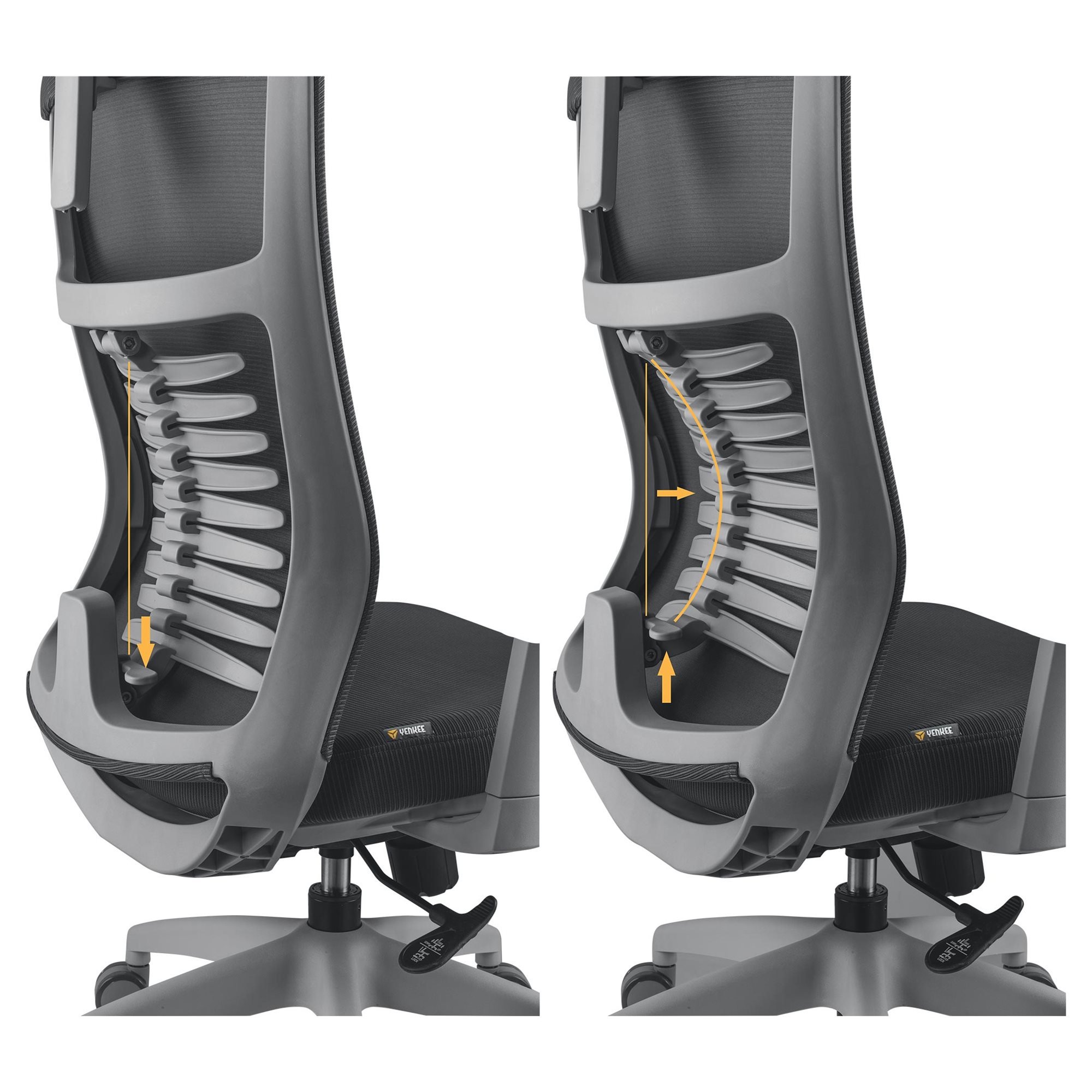 Ο σωστός τρόπος να κάθεστε είναι κάτι σημαντικό που μπορείτε να μάθετε. Στη YENKEE γνωρίζουμε ότι η σπονδυλική στήλη είναι αυτή που υποφέρει πιο πολύ από το παρατεταμένο κάθισμα, και ειδικά σε λανθασμένη στάση σώματος. Η λανθασμένη στάση καθίσματος έχει σαν κύριες συνέπειες πόνο στην πλάτη, πόνο στη μέση και πονοκεφάλους. Χάρη στον μοναδικό σχεδιασμό της ρυθμιζόμενης οσφυικής υποστήριξης που αποτελείται από 9 διπλά στηρίγματα πλάτης, θα επιτύχετε τη σωστή στάση για το σώμα σας. Τα στηρίγματα ακολουθούν το σχήμα της πλάτης και προσφέρουν 4 επίπεδα πίεσης, παρέχοντας υποστήριξη για τη σπονδυλική στήλη και το μυικό σύστημα της ράχης σε όλες τις κατευθύνσεις. Με την καρέκλα γραφείου FISHBONE πραγματικά θα μάθετε πώς να κάθεστε σωστά και άνετα.