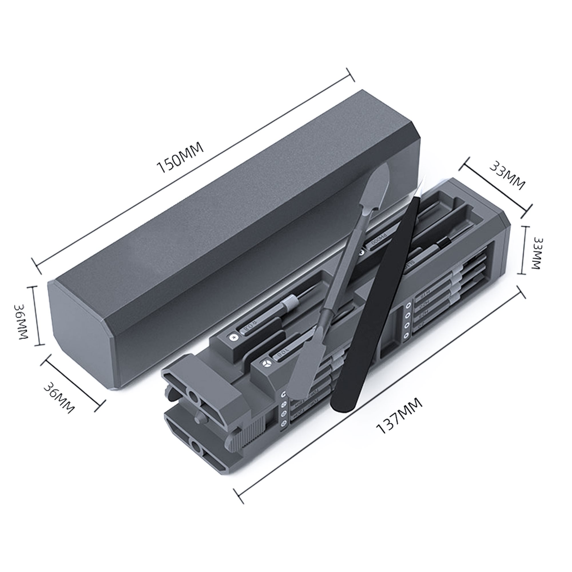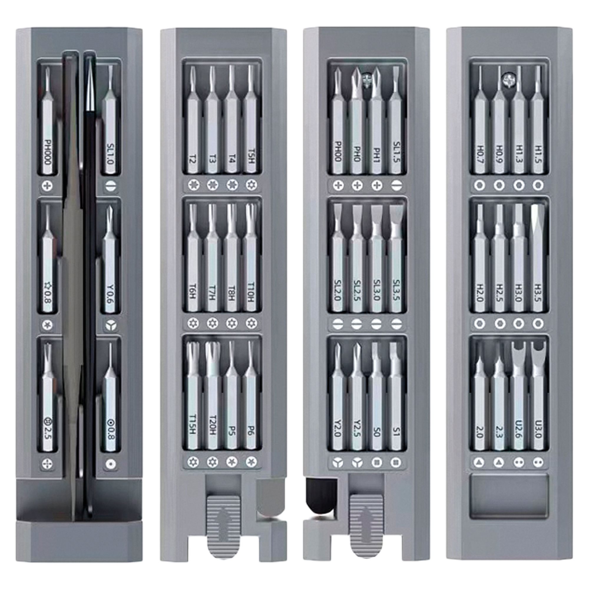 Το σετ προσφέρει 42 διαφορετικές μύτες, από τις κοινές μύτες σταυροκατσάβιδου και ίσιες μύτες έως τις πολύ σπάνιες μύτες και μύτες για ειδικές περιπτώσεις. Αυτό το σετ επίσης περιλαμβάνει ένα τσιμπιδάκι ακριβείας και μια μεταλλική ράβδο αποσυναρμολόγησης δύο πλευρών, για παράδειγμα για άνοιγμα υπολογιστών notebook.
