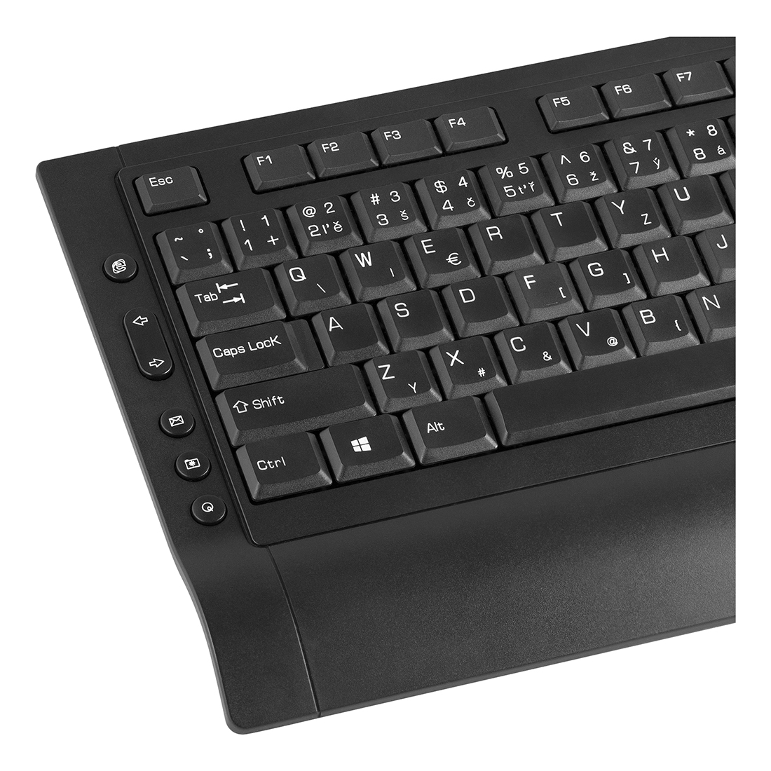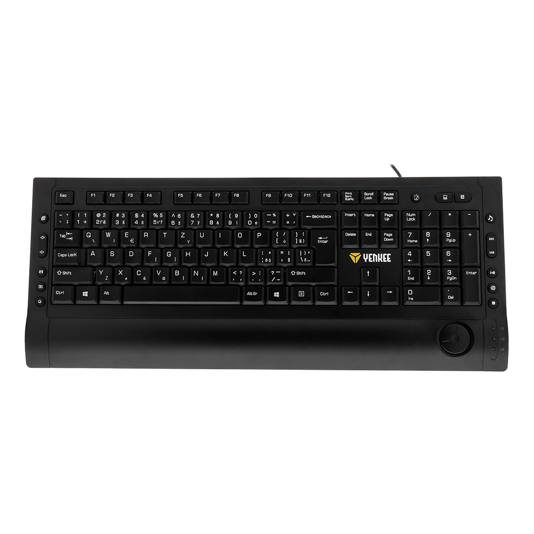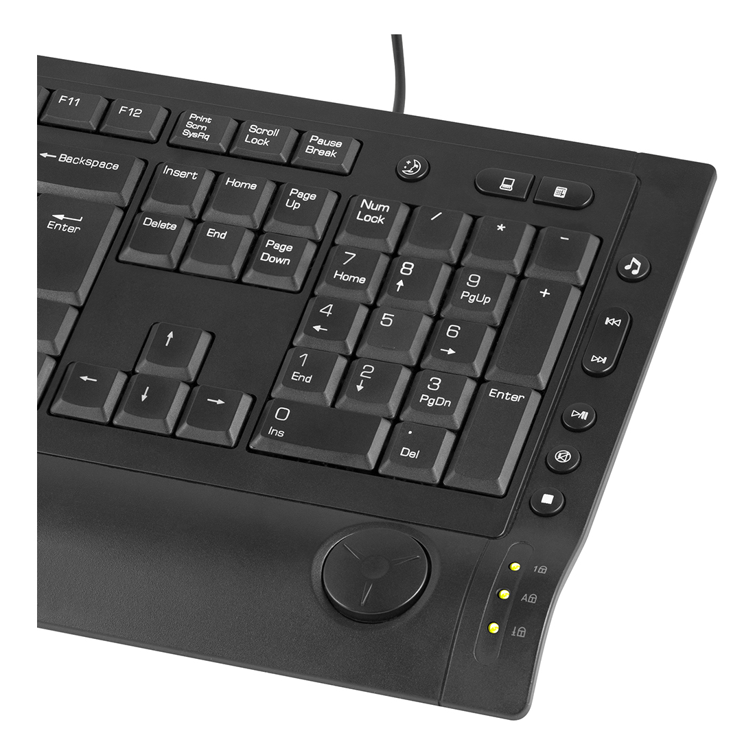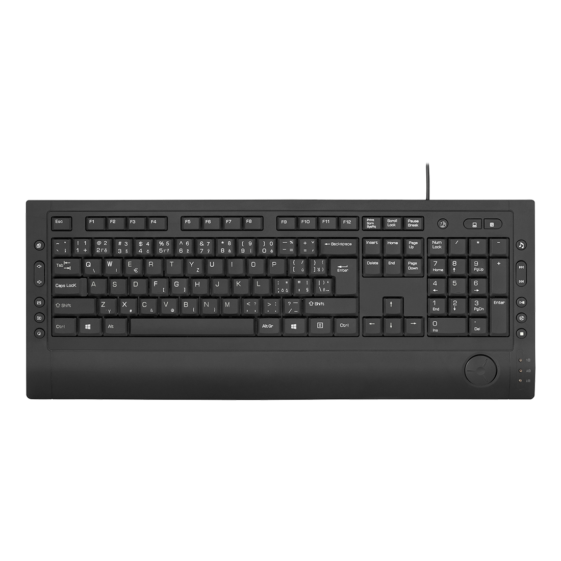 Πολύ αξιόπιστο πληκτρολόγιο πολυμέσων με διάταξη πλήκτρων λειτουργιών και στις δύο πλευρές για άνετη χρήση και με τα δύο χέρια. Το μεγάλο στήριγμα παλάμης και ο πολύ λεπτός σχεδιασμός εξασφαλίζουν βέλτιστη και ευχάριστη θέση πληκτρολόγησης. Το πληκτρολόγιο διαθέτει 104 στάνταρ πλήκτρα, 15 πλήκτρα λειτουργιών για πολυμέσα και Internet, και τροχό ρύθμισης έντασης ήχου.
